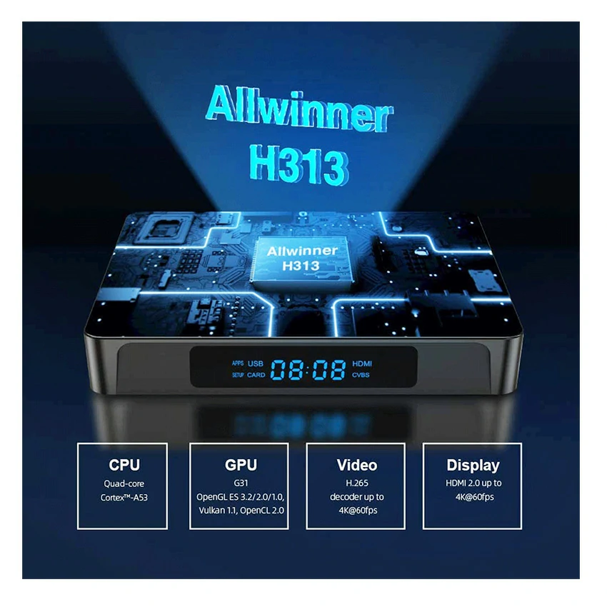 Box TV Android 4K UHD X96Q Pro / Processeur : Allwinner H313 Quad-Core Arm Cortex-A53 / Mémoire RAM : 2Go / Stockage : 16Go / Systéme : Android 10.0 / Affichage d'image : Ultra HD 4K / Décodage - H.265 4K / Service Streaming : Netflix, Youtube et plus / Connectivité : Wi-Fi 2.4/5 Ghz - E-cast / Prise en charge de la mise à niveau du micrologiciel en ligne (OTA) / Connecteurs : 2 x USB, 1 x HDMI, 1 x RJ45 - Ethernet / Garantie 1an.