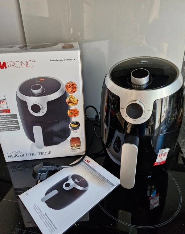 Friteuse Sans Huile CLATRONIC FR3769H / Puissance : 1000 Watts / Capacité : 1.8 Litres / Thermostat réglable en continu (80 °C – 200 °C) / Minuterie : 30 minutes / Alarme de fin de cuisson / Arrêt Automatique / Préparation rapide et économe en énergie / Protection anti surchauffe : interrupteur de sécurité / Faible émission de fumées et d’odeurs / Poignée tactile cool / Tiroir amovible avec revêtement anti-adhérant / Garantie 1an.