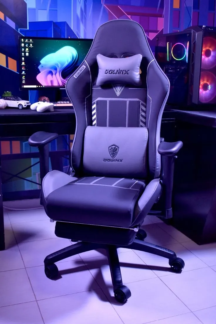 Chaise GAMING DOWINX LS6670 / Pivotante réglable avec Repose-Pieds / Avec accoudoirs intégrés et câble d'alimentation USB Avec Support Lombaire Massant / Ergonomique / Tissu Respirant / Dossier Haut / Caractéristiques avancées : Cette chaise gaming offre une grande mobilité grâce à ses roulettes pivotantes à 360° et à roulement doux / Inclinaison : de 90° à 180° pour s'adapter à vos besoins, que vous travailliez, jouiez, lisiez ou fassiez une pause / Dimensions : 53.5 x 57 x 136 cm / Couleur Gris.