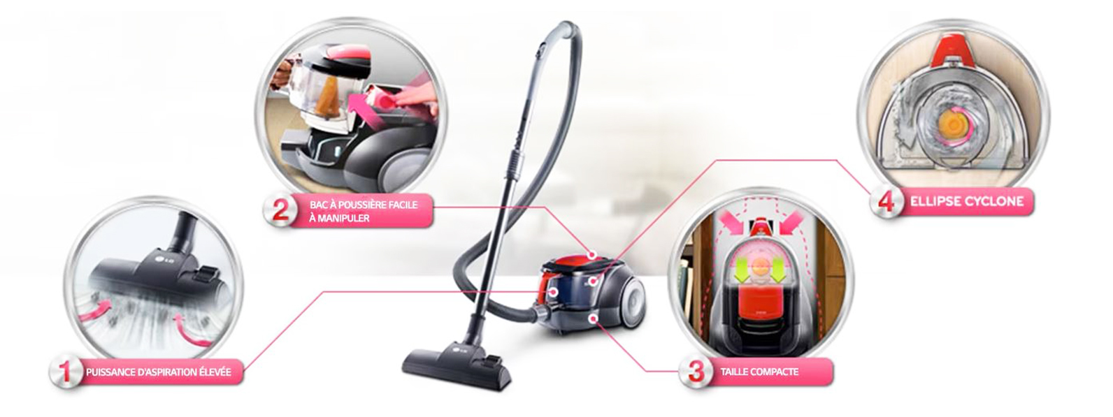 Aspirateur Sans sac LG VC5420NNTB / Puissance : 2000 Watts / Capacité de poussière : 1.3 Litres / bac à poussière cyclonique ellipse cyclone / Type de filtre d’échappement EPA11 / Tuyau en en acier télescopique / Brosse à poussière / Embout plat / Rayon d'action 8 m / Niveau de bruit: 82 dB / Longueur du cordon : 5 m / Dimensions : 270 x 400 x 234 mm / Garantie 1an.
