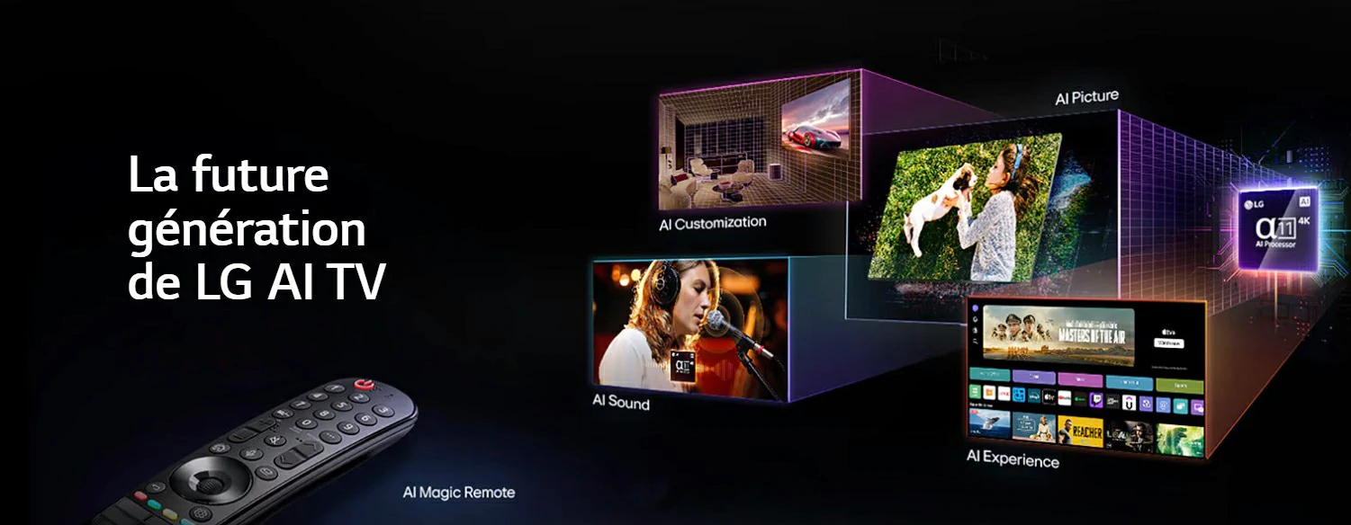 Téléviseur LG - 55A36LA.AGEE / Taille : 55 Pouces / OLED : Large gamme de couleurs / Résolution : UHD 4K (3840 x 2160 Pixels) / Processeur : α7 Gen6 AI 4K / Mode Image : Vivid - Standard - Eco - Cinema - Sports Alert - Game - Filmmaker / Dolby Vision / HDR10 Pro / HLG Pro / Grand angle de vision / Technologie de gradation Pixel Dimming / Technologie AI thinQ (reconnaissance vocale) / Systèmes : WebOS 23 (YouTube, Netflix) / Apple Air Play / Application Apple TV / Sortie Sonore : 20 Watts / Audio Compatible avec Dolby Atmos / Connectivité : Wi-Fi 5 - Bluetooth 5.0 Low Energy / Connecteurs : x3 HDMI eARC - x2 Port USB - x2 Prise antenne - Ethernet (RJ45) / Accessoires : Télécommande Magic Remote / Avec Récepteur Intégré / Dimensions (LxHxl) : 1 228x772x235 mm / Poids : 65,4 kg / Garantie 2 ans.