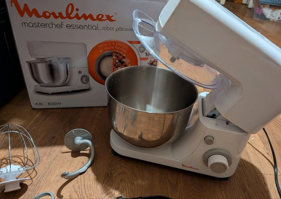 Robot Pétrin MOULINEX MASTERCHEF ESSENTIAL / Puissance : 800 Watts / Modèle : QA150110 / Capacité du bol : 4,8 litres / Matériau du bol : Acier inoxydable / Nombre de vitesses : 6 vitesses + fonction Pulse / Mouvement planétaire : Oui / Accessoires inclus : Fouet, batteur, pétrin / Fonctions : Pétrissage, mélange, fouettage / Dimensions : 41,4 x 24,4 x 35,4 cm / Poids : 5 kg / Mouvement planétaire : Assure un mélange homogène en couvrant toute la surface du bol, pour des résultats parfaitement lisses / Design robuste : Sa construction solide et ses ventouses antidérapantes garantissent une utilisation stable et sécurisée / Couleur : Blanc / Garantie : 1 an