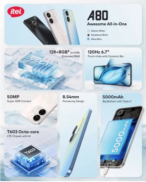 Smartphone ITEL A80 / Ecran : 6.7" IPS LCD / Résolution : 720x1600 Pixels / Luminosité : 500 nits / Taux de rafraichissement : 120Hz / Processeur : Unisoc T603 - Octo-core / Mémoire Vive : 4Go - Extensible jusqu'à 8Go / Stockage interne : 128Go / Système : Android 14 avec interface itel OS 14 / Appareil photo principale : 50 mégapixels avec Dual LED flash / Enregistrement vidéo Full HD (1080p@30fps) / Appareil photo selfie : 8 mégapixels / Batterie : 5000 mAh / Charge Rapide : 10 Watts / Connectique : USB Type-C / Dual SIM / Capteurs d'empreinte digitale / Garantie 1an.