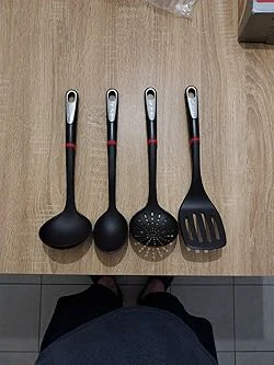 Référence produit : K206S414 | Résistance à la chaleur : jusqu'à 230°C / Nettoyage : compatible lave-vaisselle pour un entretien facile / Matériaux : nylon renforcé de fibre de verre / Sans BPA ni phtalates : respecte le goût et l'odeur des aliments / Design ergonomique : poignées avec anneau en silicone antidérapant / Contenu du Set : Cuillère de cuisine idéale pour mélanger et servir vos plats préférés, Louche : parfaite pour servir soupes, sauces ou bouillons, Écumoire (cuillère passoire) idéale pour égoutter pâtes ou légumes avec facilité, Spatule à angle parfaite pour retourner et servir viandes ou poissons / Couleur : noir avec accents rouges.
